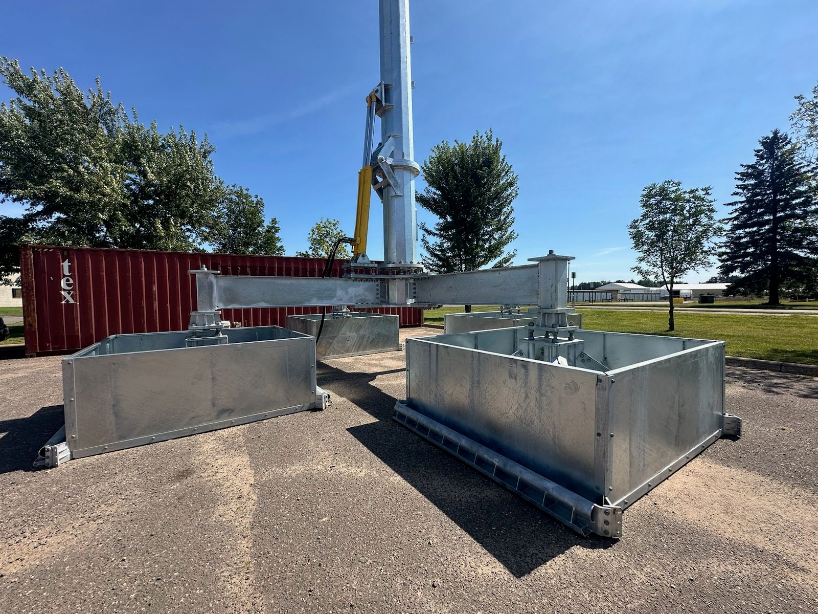 The AFS 1350 foundation uses 4 of our AFS 350 foundations with a platform for 100' tilt-up pole installations. With a 28' diameter footprint, this modular foundation system supports a base moment of 500,000 foot-lbs. The ballast can be local dirt, aggregate, pavers or blocks.